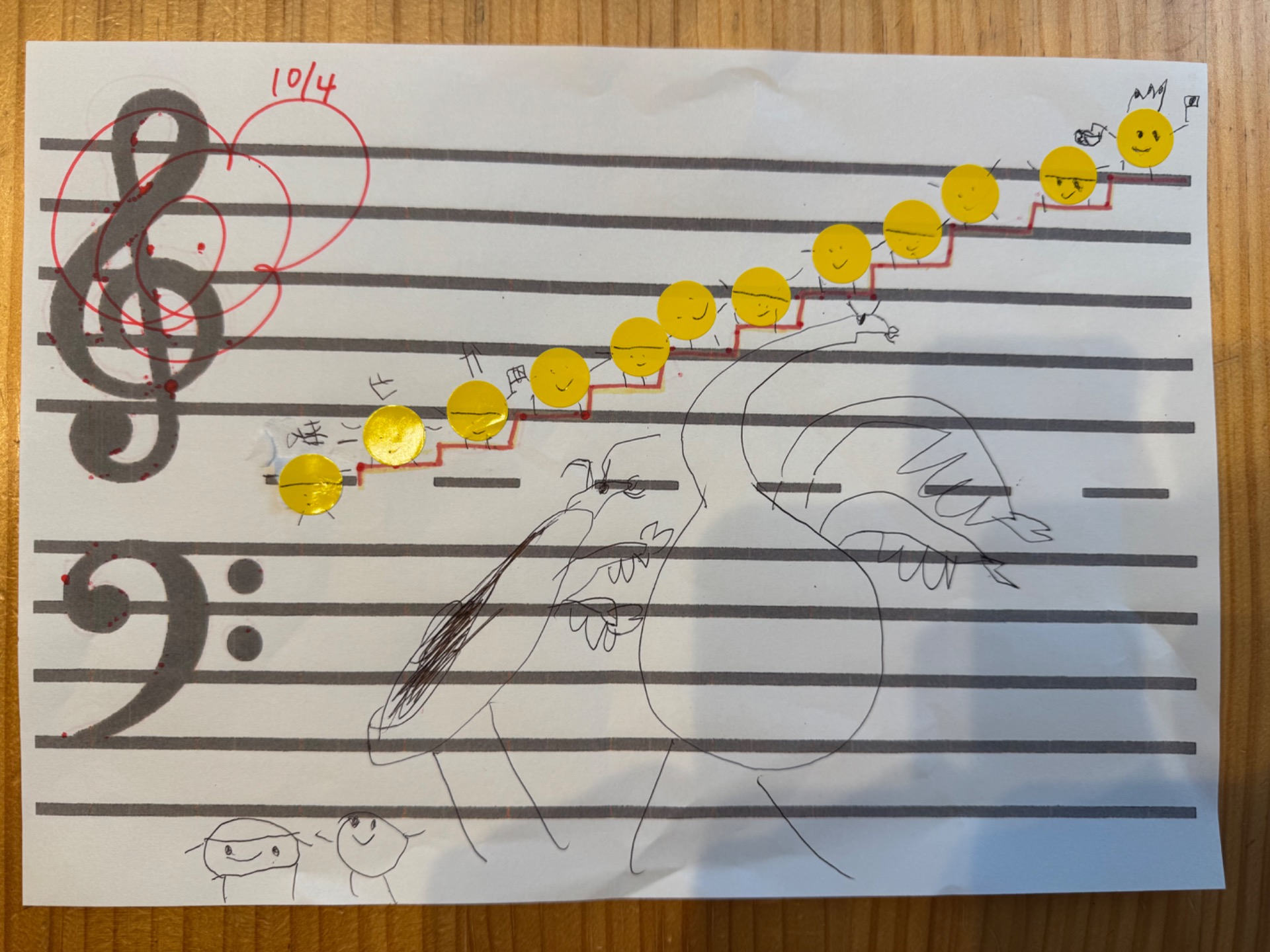 線の上と間に並ぶ音符を分かりやすくするために、私が小さなお顔を描いたシールを用意して、生徒さんにペタペタと貼ってもらいました。